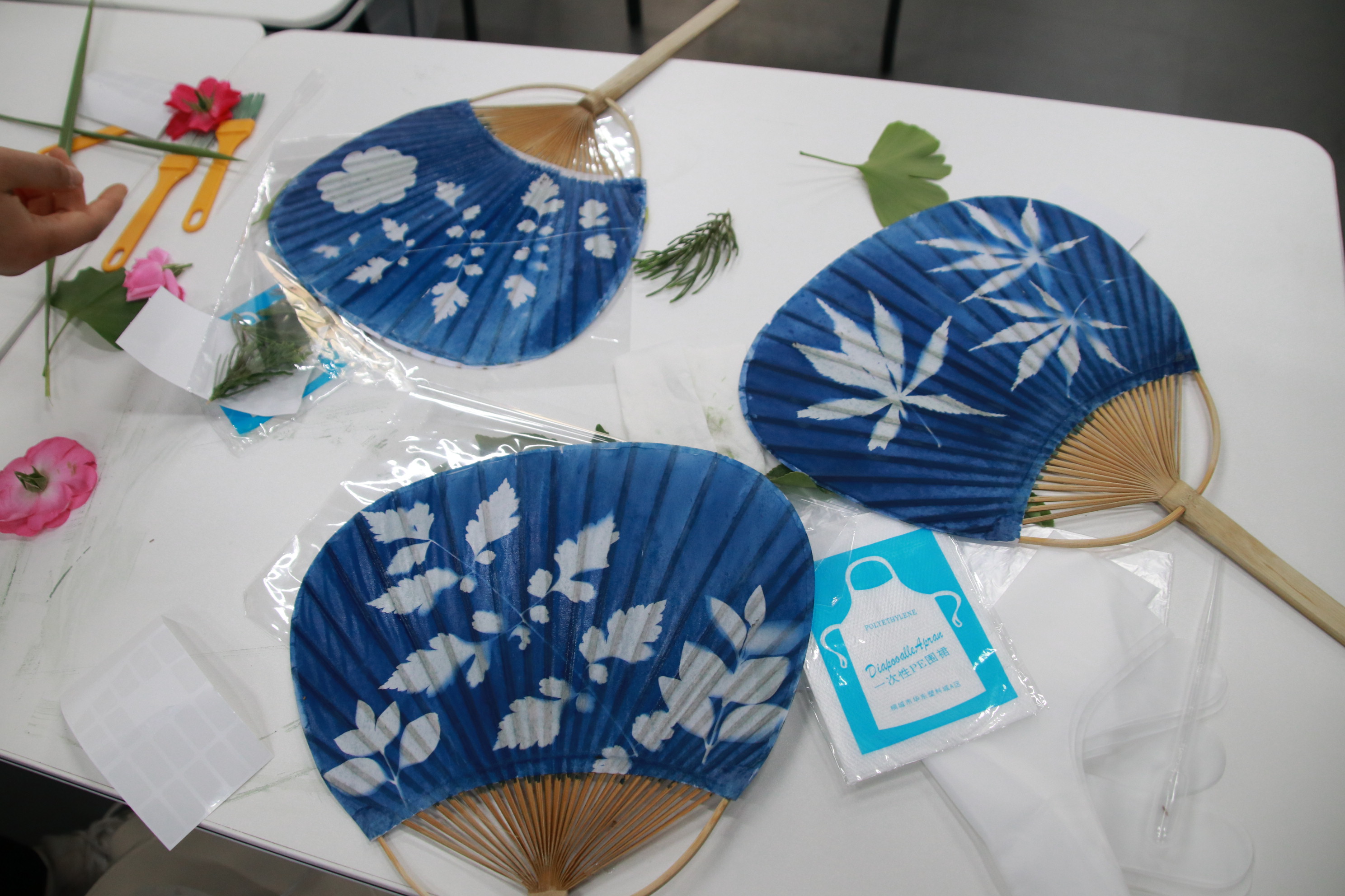 教学环节过后,同学们开始自由分组、动手制作。大家细致、耐心地在纸张、扇子、帆布包上涂抹蓝晒液,按照自己的喜好将植物、胶片、剪纸等摆放固定好,放到室外阳光下完成曝光,最后通过水洗显影,收获了独一无二的蓝晒作品。活动现场热闹非凡,老师与同学们热情交流、分享经验,同学们不仅收获了一项新技能,了解了摄影原理与古典工艺的融合,探索了光、影、色的极致美学体验,更在炎炎夏日里加强了与同伴之间的交流沟通,在艺术创作的过程中实现身心健康发展。