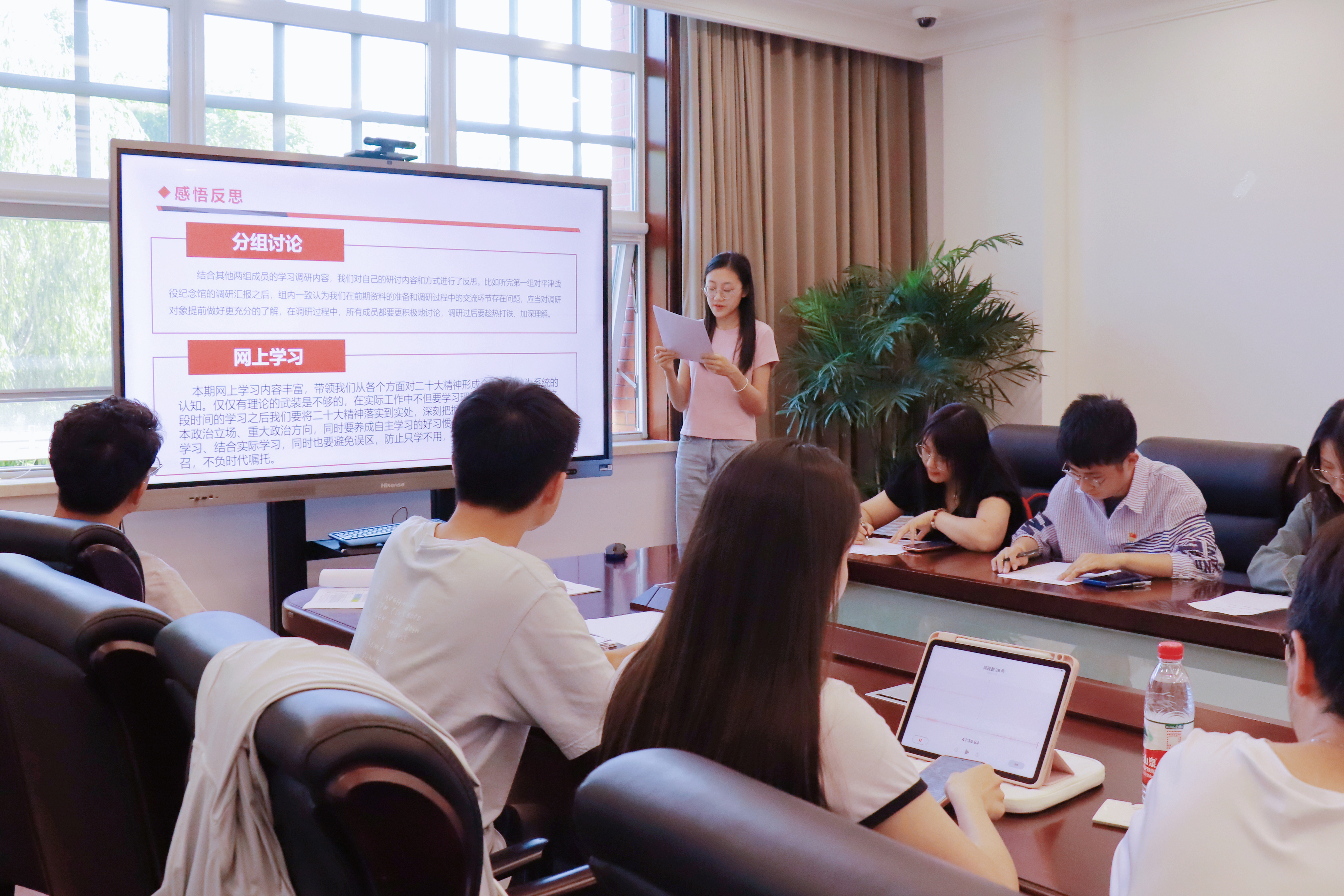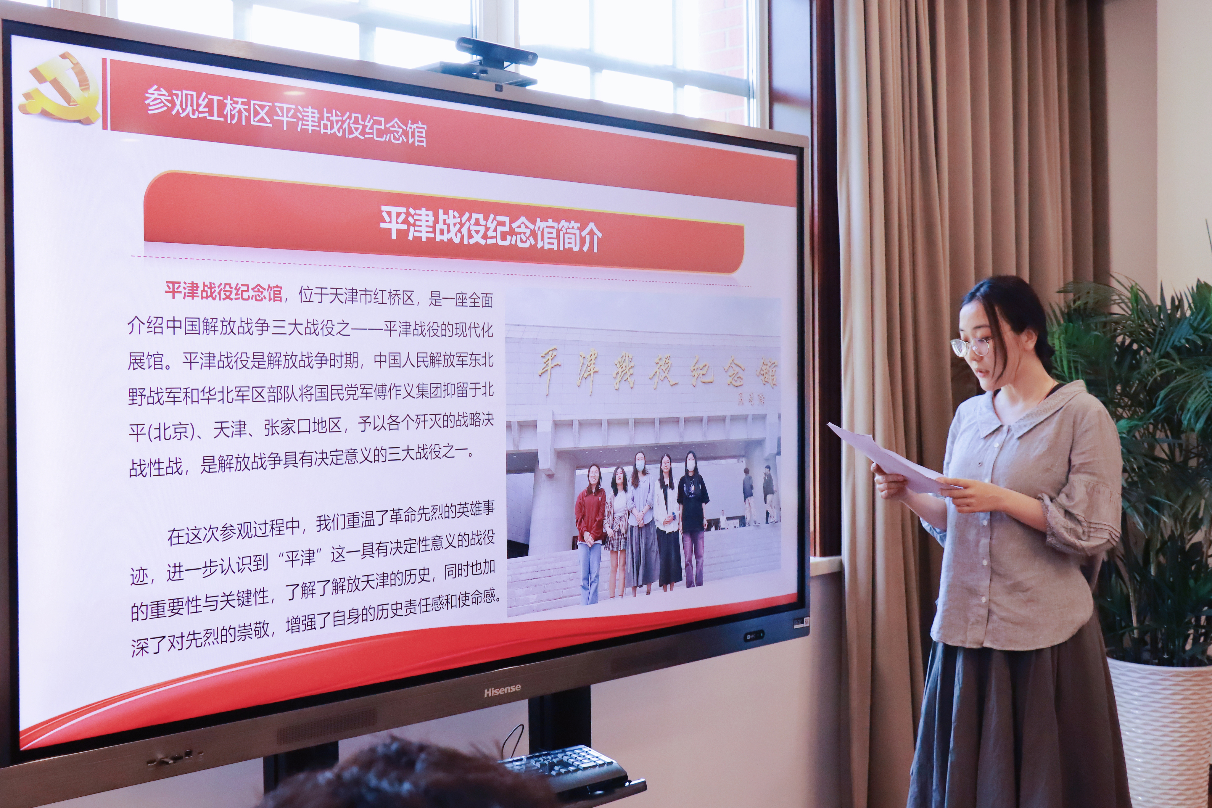 由2021级硕士研究生王隽、袁满,2022级硕士研究生刘晨、石琛、韩子怡五位同学组成的第一小组做了题为“赓续红色血脉,传承红色基因”的汇报,围绕参观平津战役纪念馆的调研经历,结合老员工网络党校培训平台的理论学习,分享了对习近平强军思想的深刻理解和认识,表达了增强自身历史责任感和使命感的决心。