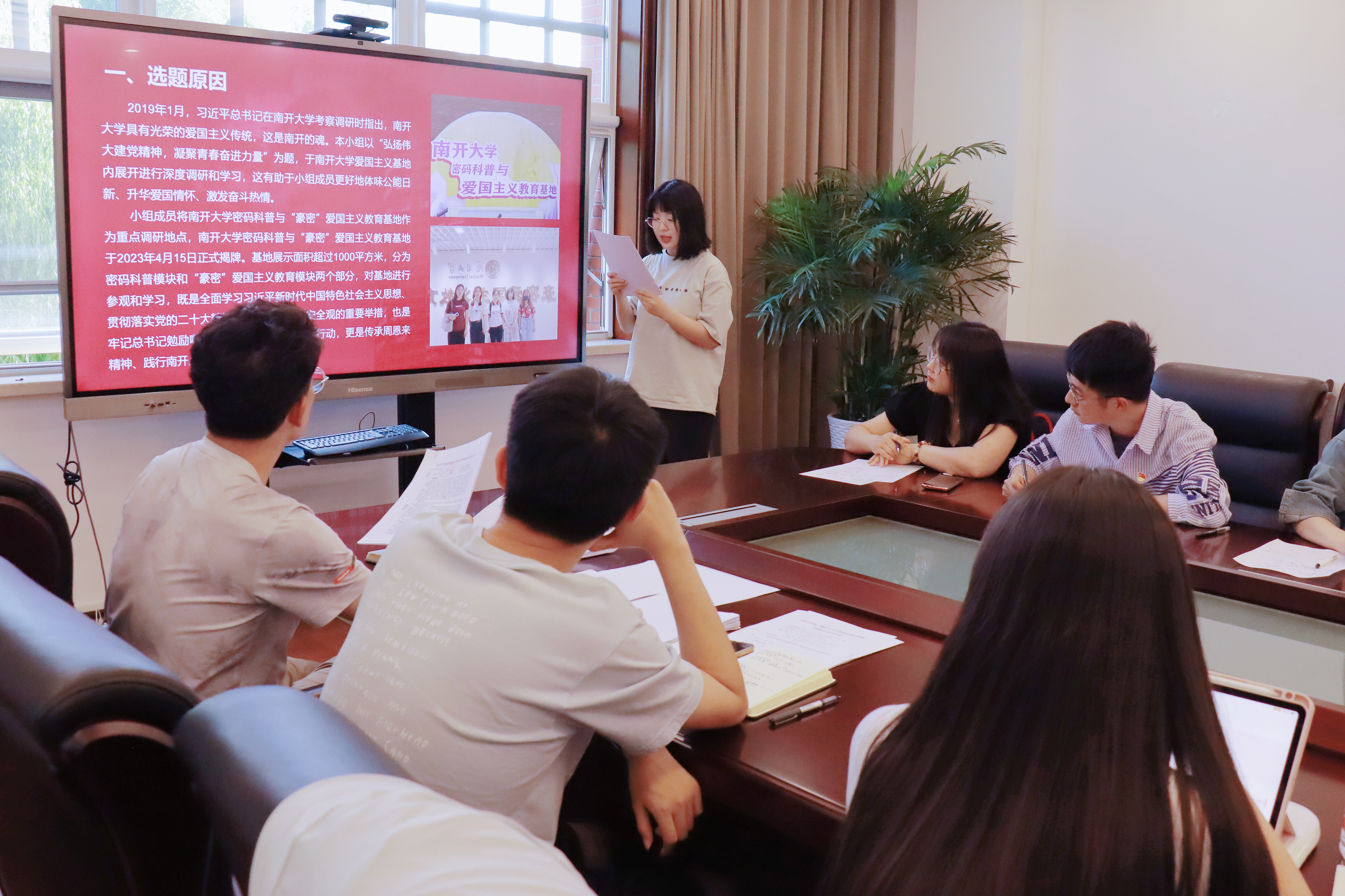 由2021级本科生蔡乐怡,2020级本科生冯乐文、陈佳媛、李紫琦、范可欣五位同学组成的第三小组做了题为“弘扬伟大建党精神,凝聚青春奋进力量”的汇报,围绕参观永利集团3044密码科普与‘豪密’爱国主义教育基地的调研经历,分享了周恩来及南开与中国密码事业之间的故事,表示要增强国家安全意识,践行总体国家安全观,以忠诚之心和勇毅之举维护国家安全,不负时代重托。