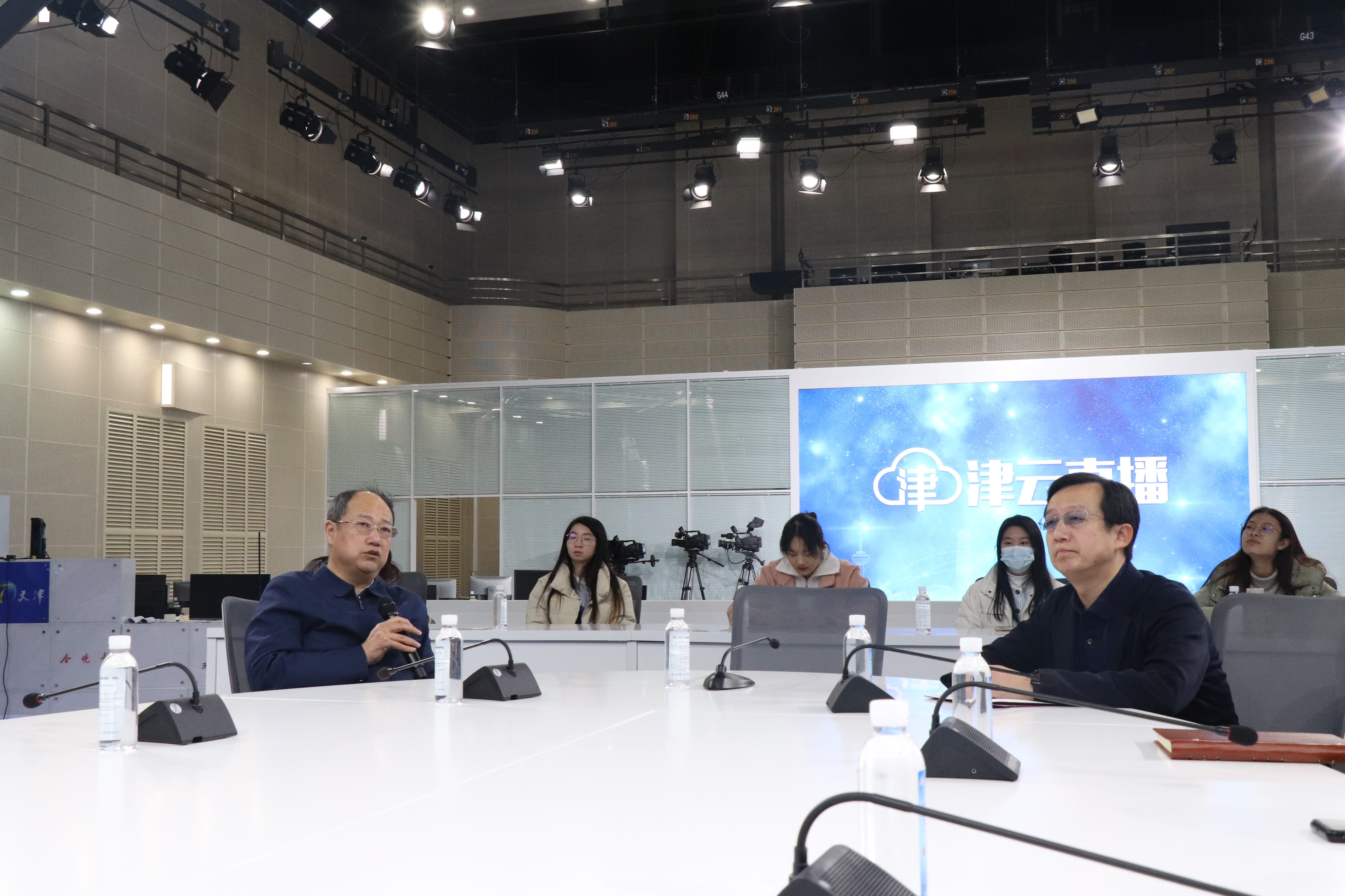 在天津海河传媒中心,海河传媒中心党委常委、副总裁印永清,宣策协调部主任杨斌接待师生一行,为大家简要介绍了天津人民广播事业的发展历程,师生一行参观了新闻广播室、天津日报社编辑室、“津云”中央厨房,详细了解了我市新闻媒体历史沿革、融合发展以及“津云”中央厨房可视化场景支持功能情况。