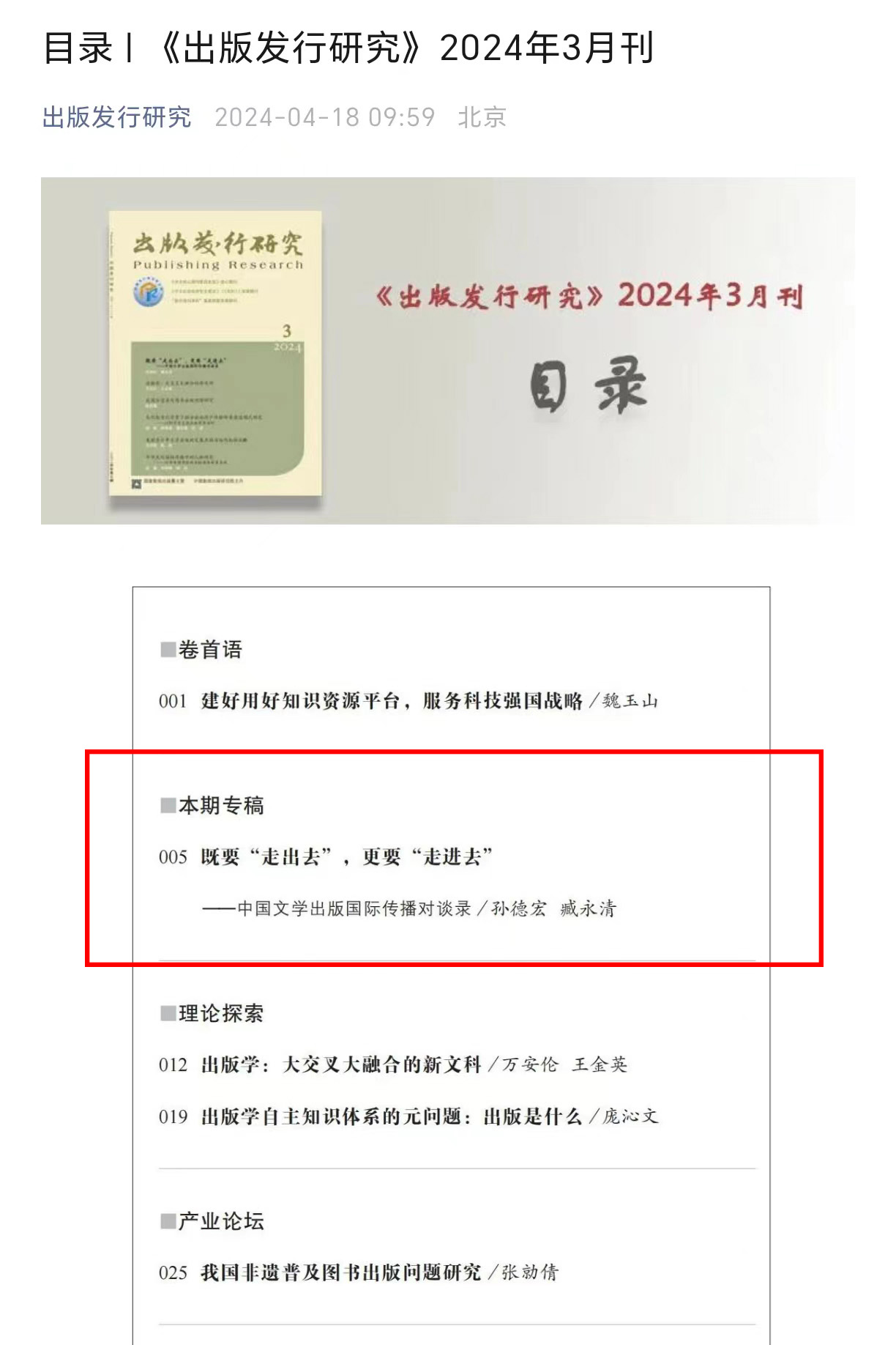 2024年第3期《出版发行研究》刊发了公司孙德宏教授与人民文学出版社社长、编审臧永清发表的《既要“走出去”,更要“走进去”—中国文学出版国际传播对谈录》。