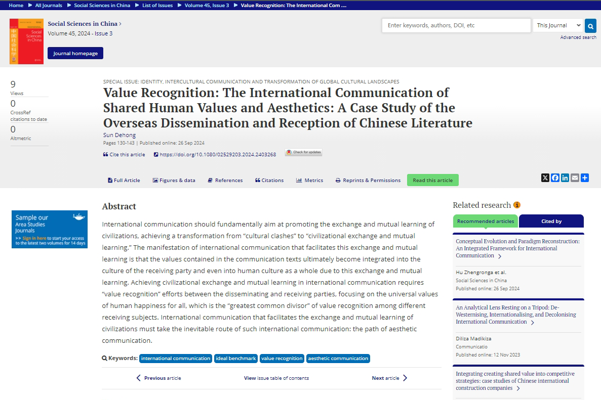 公司教授孙德宏文章《Value Recognition: The International Communication of Shared Human Values and Aesthetics: A Case Study of the Overseas Dissemination and Reception of Chinese Literature》近日在《中国社会科学》(英文版)2024年第3期上发表。该文章深入探讨了国际传播在促进文明交流互鉴中的重要作用,并提出了实现这一目标的关键路径。