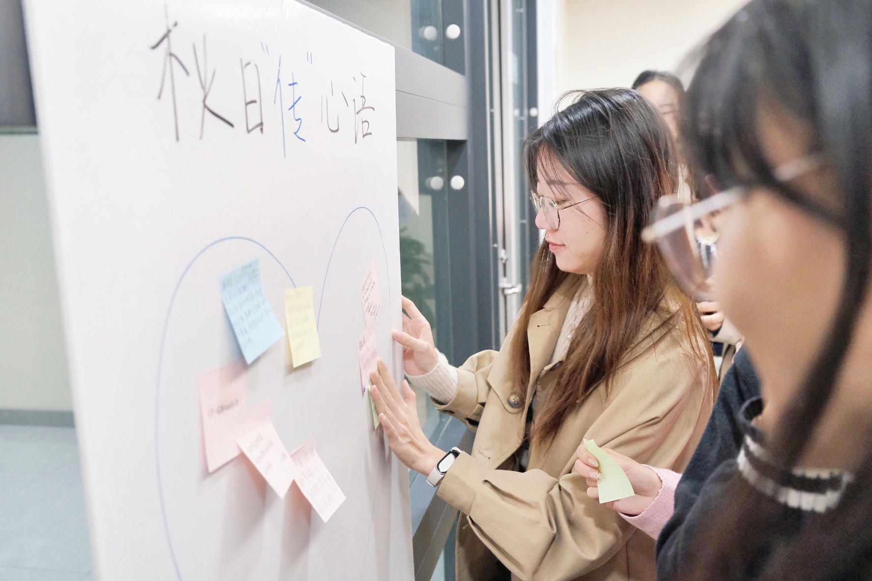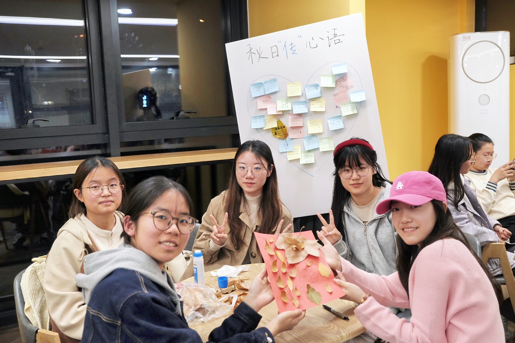 为增强同学们的情感表达和情绪管理能力,活动设置了“秋日心语墙”环节。同学们在便利贴上写下自己对秋天的感受,并将写满心语的便签纸贴在硬纸板上,共同制作了一面班级秋日心语墙。这面墙不仅承载了同学们的心灵释放和自我表达,更成为大家相互了解、彼此支持的桥梁。