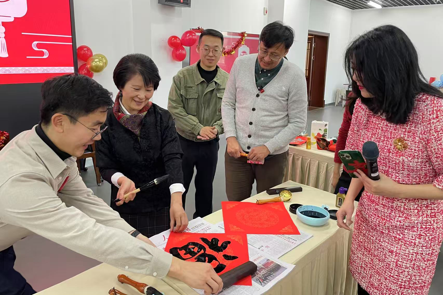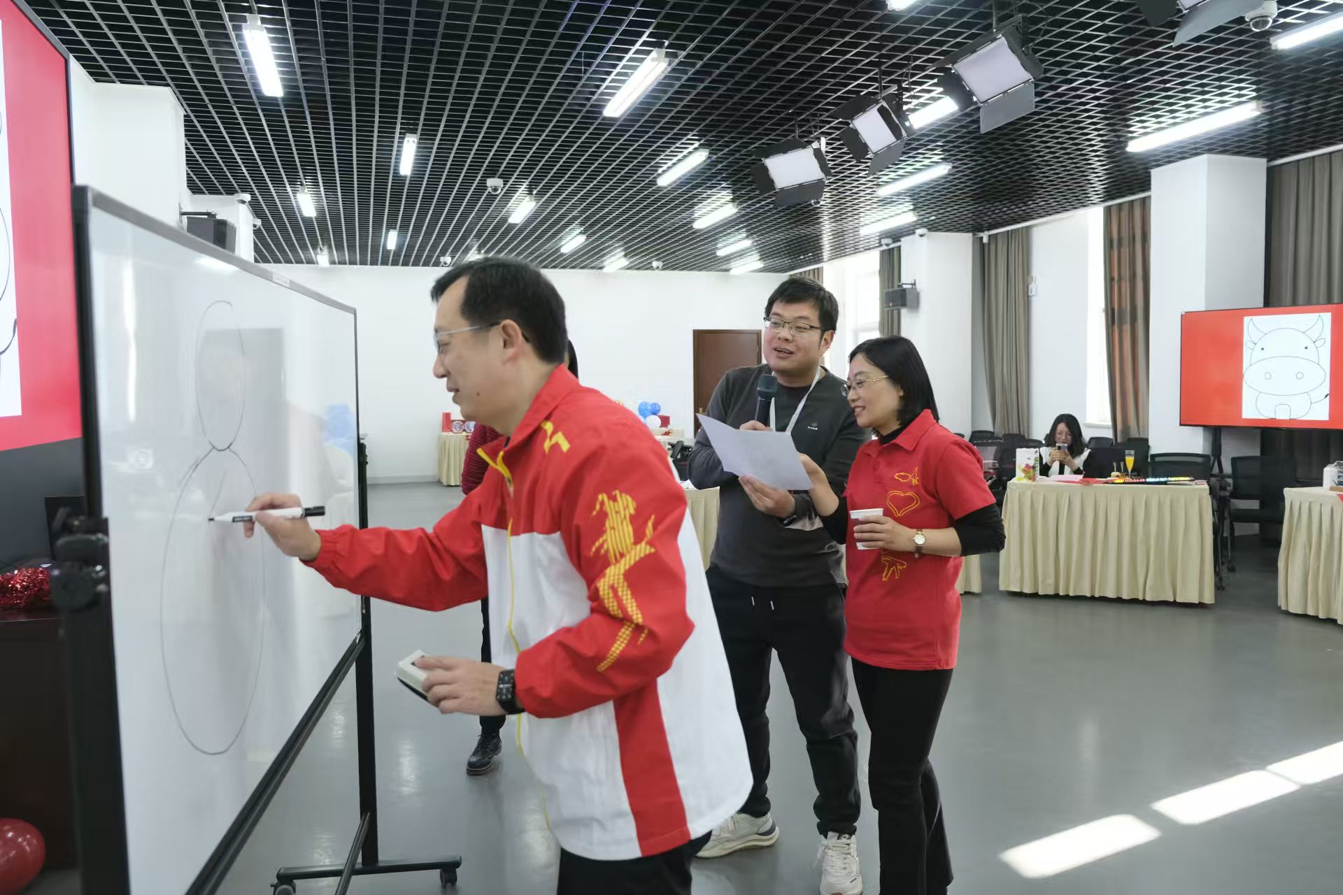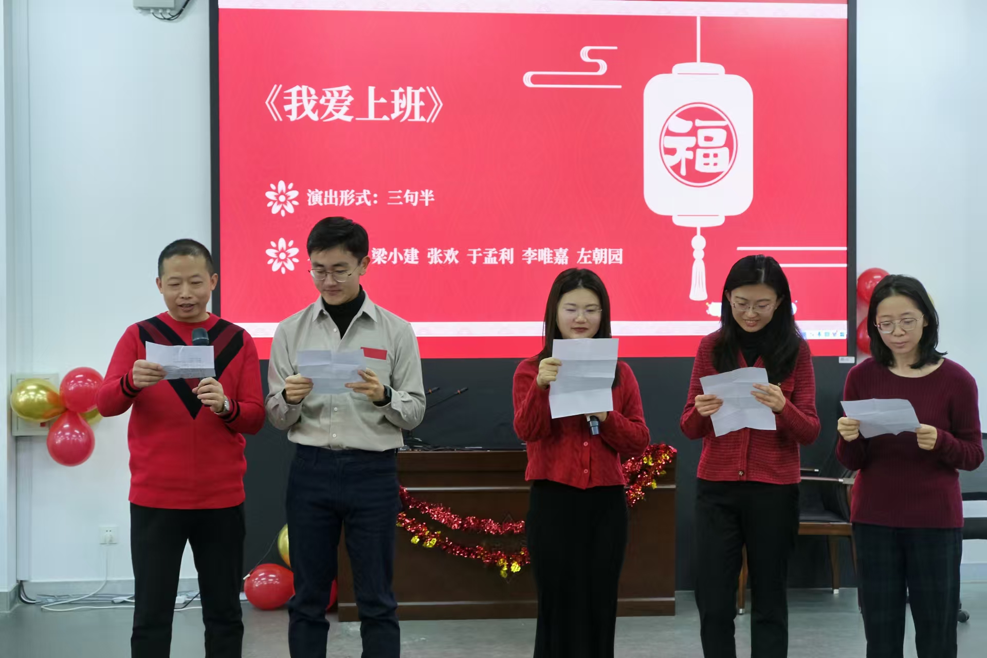 文艺表演环节精彩连连。梁小建、张欢、于孟利、李唯嘉、左朝园带来的三句半表演《我爱上班》幽默诙谐,表达了“新传卷王们”对工作的真诚热爱;吴一可和陈秋旻的独唱《我愿意》、《唯一》,王若璇和孔祥宇的对唱《神话》都深情动人,令人陶醉;陈鹏的竖笛独奏《铁血丹心》大气蓬勃,将观众带入了音乐的意境;陈娜、刘运峰、孙德宏、王杉的小合唱《洪湖水浪打浪》更是引发全场共鸣。公司领导带来了诗朗诵《新年,你好》,用声情并茂的语言表达了对全体师生的祝福和对公司未来的期望。刘运峰、孙德宏和王晓晖三位教授还为大家带来了一场精彩绝伦的书法展示《迎新春,送福字》,福字之美,为新年增添了喜庆氛围,老师们也在抢接福气的欢乐中,感受到中华传统文化的魅力。
