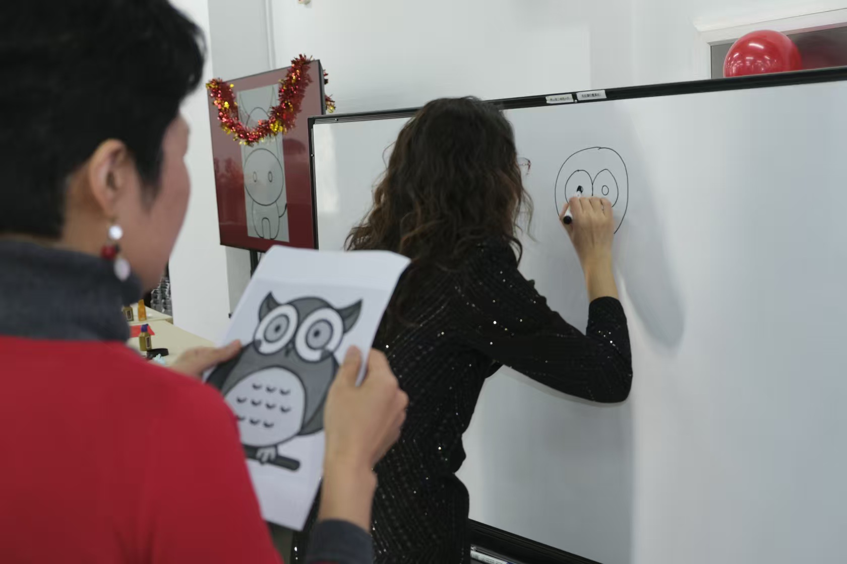 互动环节,老师们共同参与了“逛三园”、“传话比画猜”、“你说我画”等富有创意和趣味性的游戏。这些游戏设计巧妙,既考验老师们的默契配合,又增进了教师之间的友谊。“传话比画猜”分成青椒组与教授组,两队表演都既认真又活泼,让全场充满欢声笑语。全员参与的“逛三园”游戏更是对老师们反应能力的大考验,尤其是“南开园”这个环节,表达出老师们对公司的深深热爱。