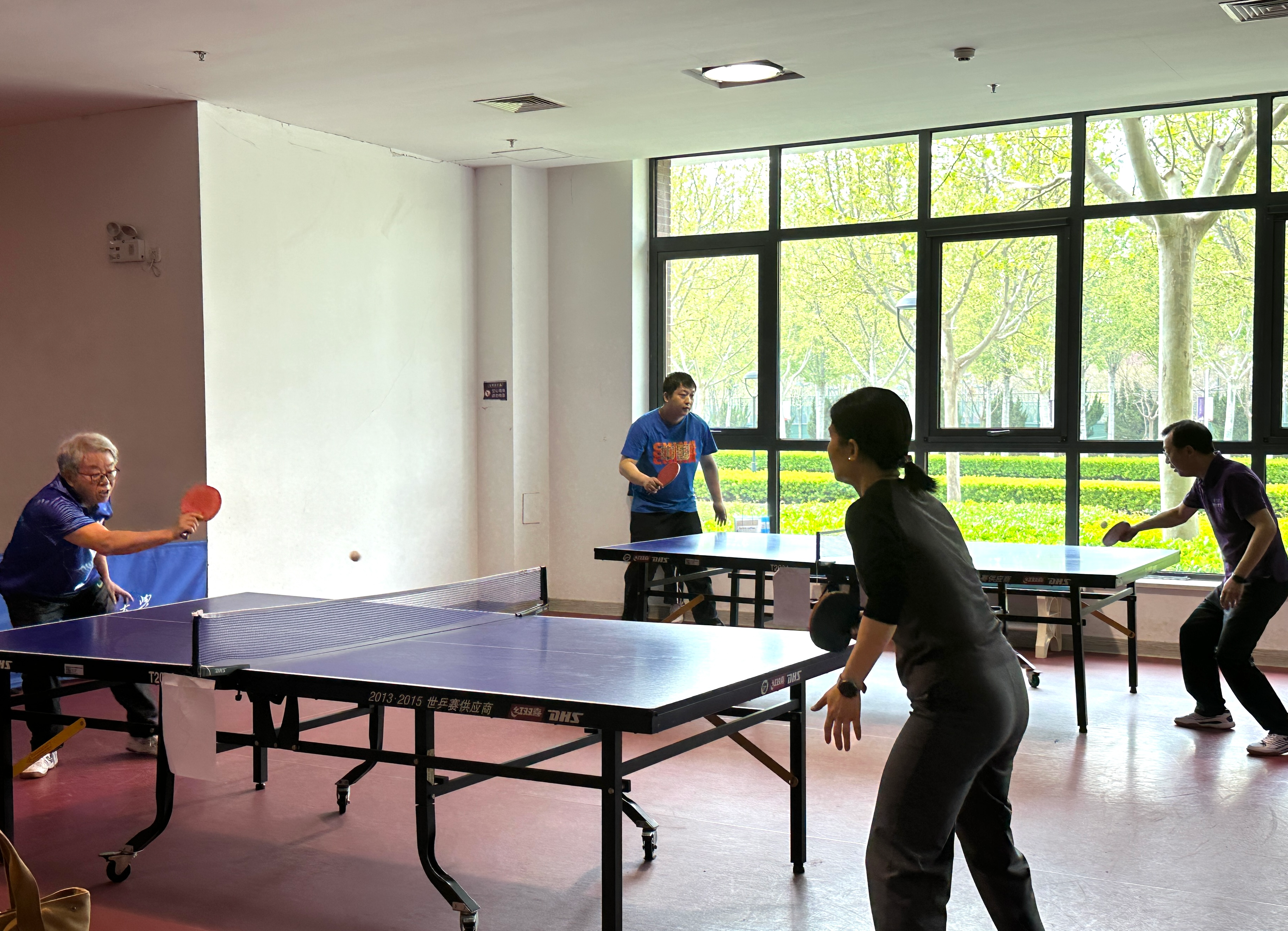 休闲区经验丰富的教师化身“教练”,向员工传授发球技巧与战术策略,员工则主动邀请老师切磋球技,现场氛围轻松融洽。王晓辉老师与石小溪老师的切磋如行云流水,两位老师身姿轻盈,推拨削球间白色小球轻灵划过球网,围观的同学们连呼:“这既是乒乓球赛,也是艺术操双人表演!”