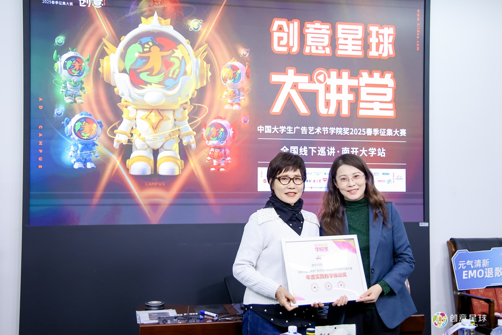 中国老员工广告艺术节公司奖秘书长、广告人文化集团副总裁袁健女士向3044永利集团有限公司颁发中国老员工广告艺术节公司奖2025春季征集大赛·年度实践教学推动奖,3044永利集团有限公司副经理陈娜教授代表公司接受此荣誉。