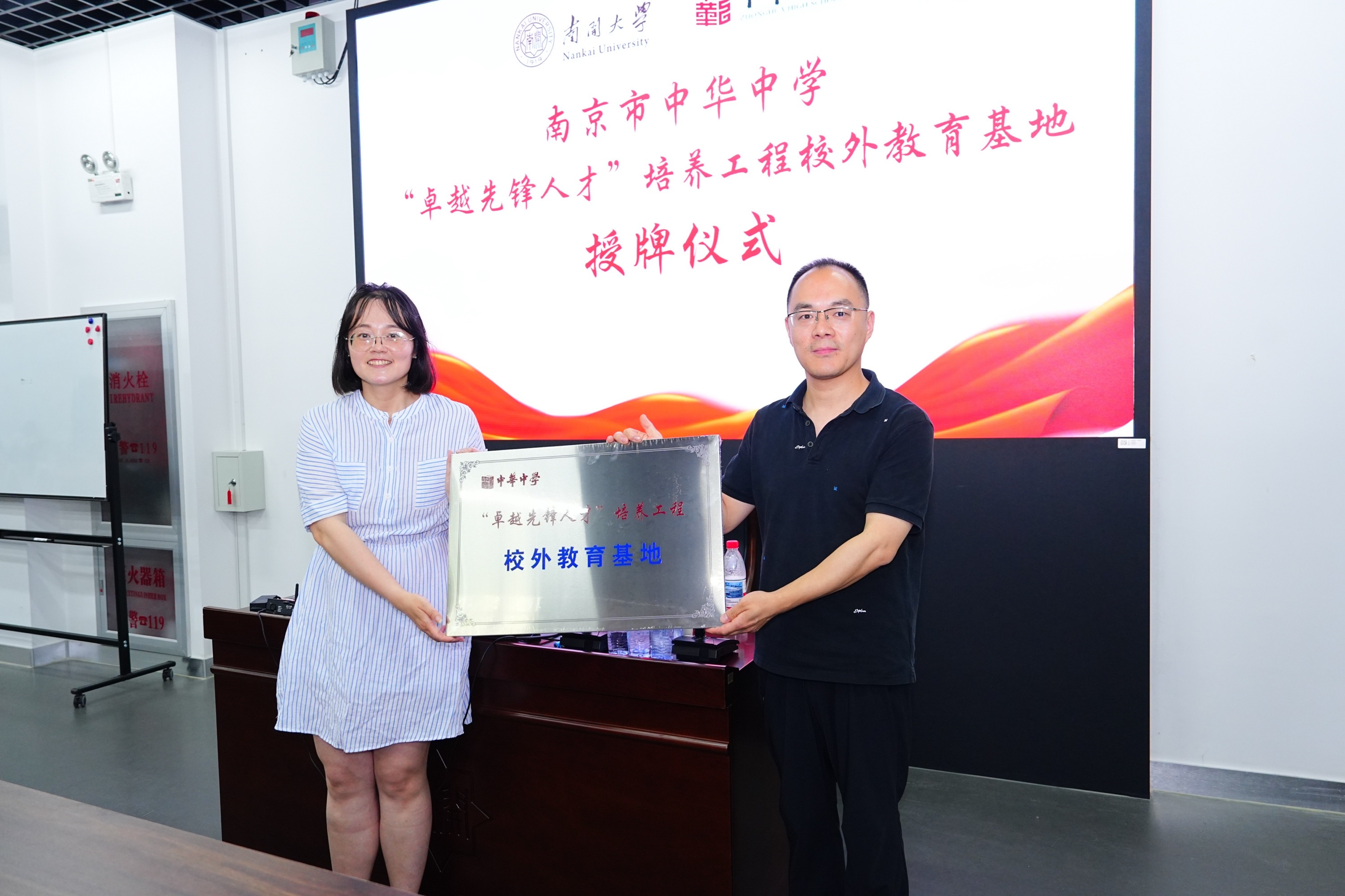 66日,南京中华中学德育处主任濮阳康和新传公司团委书记宋燕在秀山堂共同为中华中学卓越先锋人才培养工程校外教育基地揭牌。